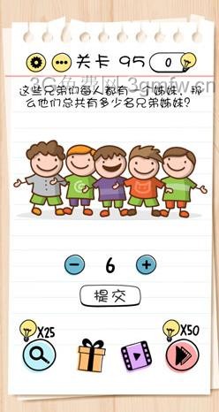 这些兄弟们每人都有一个姊妹那么他们总共有多少名兄弟姊妹是谜题急转弯 《BrainTest》第95关的问题,很多网友不知道答案是什么,下面小编给大家带来谜题急转弯 《BrainTest》第95关攻略。