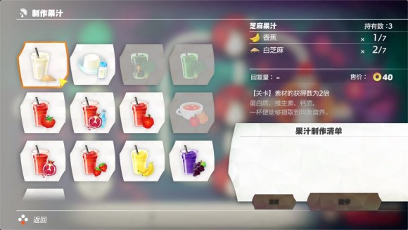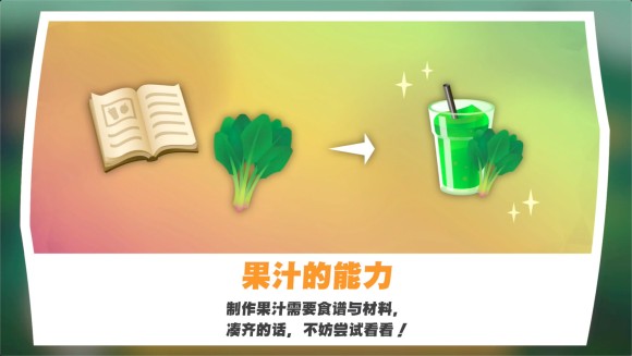 玩家可以在宝箱、关卡奖励、城镇任务奖励中获得各种食谱,一个食谱可能包含1-4种不同的果汁的配方,说明某种果汁的效果、需要哪些素材来制作,售价多少等。