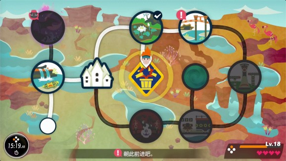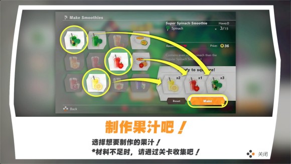 之后的世界,每个关卡的标题页面,可以看到产出哪些素材。一般是五种素材,在关卡中看到蓝色问号拉开 Ring-Con 收集各种素材,之后就能制作果汁了。