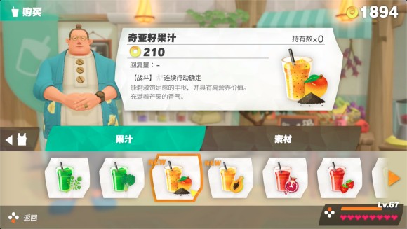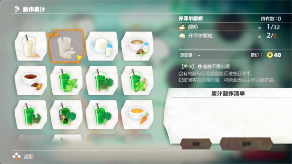 这个果汁非常好,可以让你专心跑步收集素材,不用闪躲魔兽了。我之前二段跳经常会失误撞上魔兽,打得不情不愿的,有了这个果汁,可以直接让它们消失。就是开菲尔颗粒得单独刷, 我有点懒。