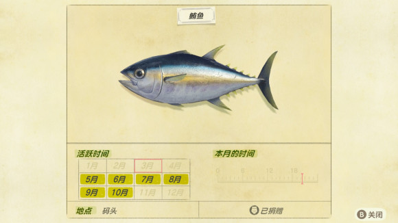 动物森友会《AnimalCrossing》鲔鱼怎么钓? 参考答案: 对我来说是很难,因为不住北半球,撒了39个鱼饵钓到的,从这个数据看,比鬼头刀要稍微简单点,也可能是我钓鬼头刀的时候脸太黑。 老友网www.andlaou.com免费为你分享
