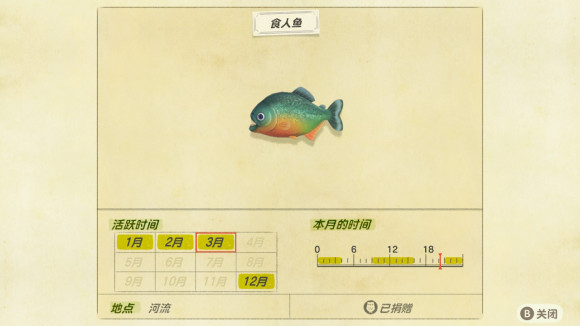 动物森友会《AnimalCrossing》食人鱼怎么钓? 参考答案: 较稀有鱼,除了4pm-9pm都可以钓,小鱼影,比黄金河虎简单,又比常见鱼少一点,错过北半球等6月。 老友网www.andlaou.com免费为你分享