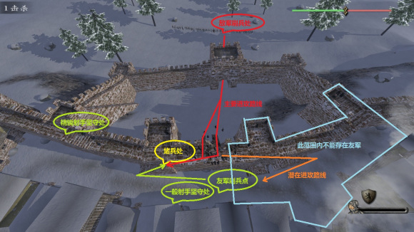 1、 浅蓝色范围内不能存在友军,以免吸引敌人沿橙色路线进攻,必要时射杀该处的友军;