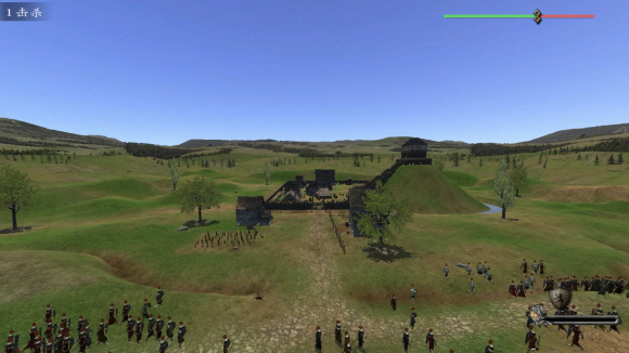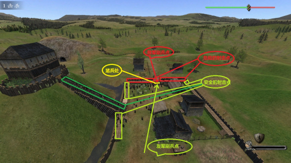 ◆在平地用低矮栅栏围起来的堡垒,只有大门框1条进攻路线,大门处用堆积的酒桶减少了通道的宽度,堵口效果一般,由于堵口位置平坦,故不容易遭受敌军远程攻击;有6个默认使用的射击点(4处平板,1处楼梯,1处空地),正门两侧平台上有被射击的危险,射手总体射击欲望较好(楼梯处最好);城内宽敞,指挥空间大;需要较多射手(采用建议的守城策略,需要坚守的射手50人),但场上坚守的射手人数不宜超过己方出场人数的一半,以免堵口士兵消耗殆尽,而援军因己方人数未减少到一半而不刷出,致使敌军涌入城内;对抗5倍数量以下的敌军可以尝试守。