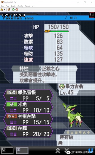 穿过12号路可以来到村庄桥, 水纹冲浪可以遇到乘龙。 继续向左来到11号路, 摇晃草丛可以遇到敏捷虫、骑士蜗牛等稀有精灵, 喜欢草系精灵的可以练练毕力吉翁。 物攻120防御72特攻60特防129速度108