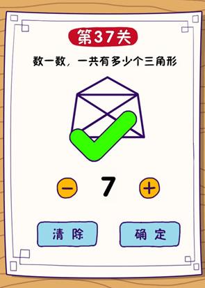 数一数一共有多少个三角形是《这题太难了》第37关的问题,很多网友不知道答案是什么,下面小编给大家带来这题太难了第37关攻略。 问题:数一数一共有多少个三角形? 答案:7。 老友网www.andlaou.com免费为你分享