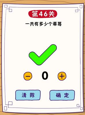 一共有多少个草莓是《这题太难了》第46关的问题,很多网友不知道答案是什么,下面小编给大家带来这题太难了第46关攻略。 问题:一共有多少个草莓? 答案:把三个草莓叠合在一起,消除后输入“0”,点确定。 老友网www.andlaou.com免费为你分享