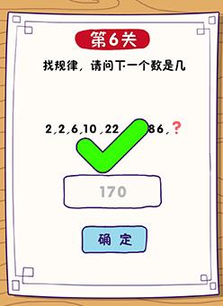 找规律请问下一个数是几是《这题太难了》第6关的问题,很多网友不知道答案是什么,下面小编给大家带来这题太难了第6关攻略。 问题:找规律请问下一个数是几? 答案:170(86x2-2=170)。 老友网www.andlaou.com免费为你分享