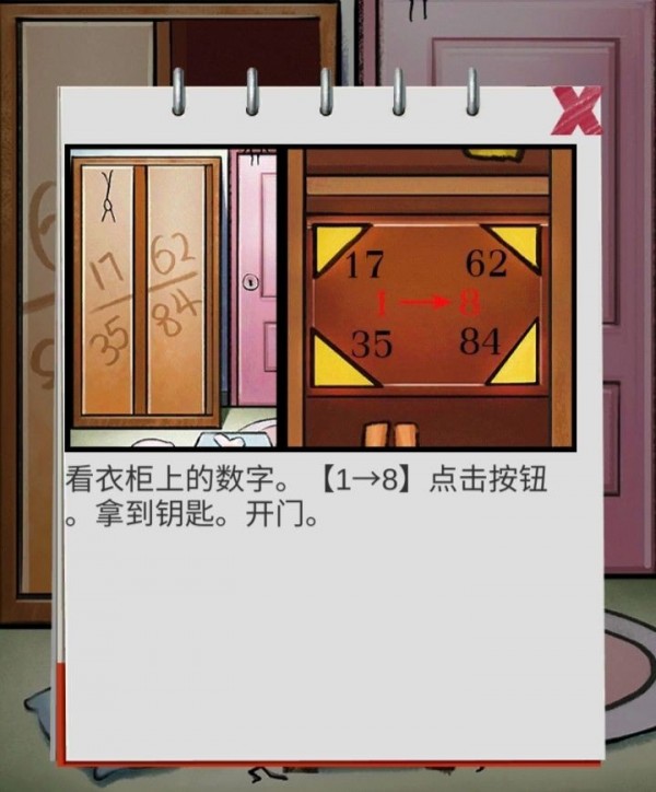 29,捡起钥匙,打开衣柜,点三下右边的白条,钥匙掉进掉进袋子里,从袋子里拿出钥匙,开门