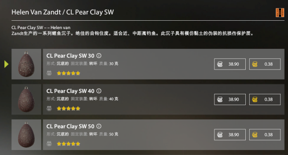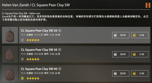 沉子在水底起锚固作用,为了让鱼饵固定到水底不发生移动,原则是尽可能找到不发生移动的最低重量以获得最高灵敏度,并且为了起到隐蔽作用,配色尽可能选择和水底同配色,根据测杆测量底部一般为泥土或者黏土,所以首选就是黏土色沉子。根据经验测试在老奥和28图40g的沉子就有比较好的锚固效果,所以主推40g。以下几个沉子40g配重都可以选择。