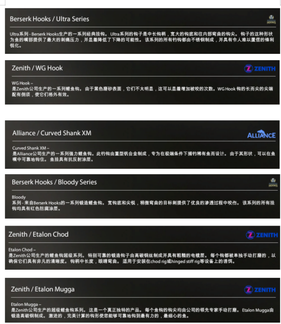 首先根据搬砖目的,稀有鱼鱼钩Alliance/Curved Shank XM直接PASS。其次,根据钓组,Zenith/Etalon Chod直接排除。