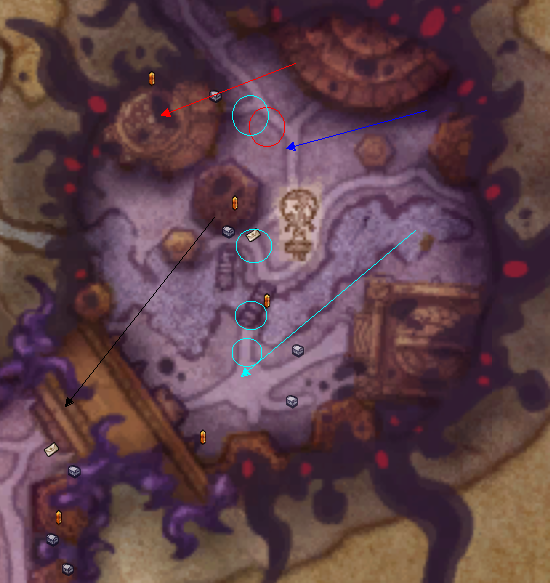 黑色箭头:3级腐化区智慧谷入口。蓝色箭头:精英小怪1。技能1:丢飞玩家(类似自由镇丢T技能)。技能2:跳跃到玩家当前位置,造成昏迷以及减少大量理智,注意规避。技能3,怒吼,减速玩家,并打断施法。青色箭头:精英小怪2。技能1:对玩家当前位置吐水,造成伤害并减少理智,及时规避。技能2:对玩家当前位置吐大量毒水,请注意规避(看见读条立刻移动)。红色箭头:区域最终BOSS,必须将谷内小怪进度清理至100%,并击杀精英小怪1、2,方才出现。BOSS技能1:正面直线顺劈斩,造成大量伤害,减少大量理智,造成昏迷效果,并留下黑水,造成持续伤害和理智降低。BOSS技能2:随机向周围丢出黑水,被击中或者站上去,持续掉血并减少理智;黑水在数秒后变成小怪。BOSS技能3:召唤出数个黑球围绕BOSS,如果玩家触碰,造成昏迷并减少理智;数秒后黑球会直线向外飞出,若碰到造成伤害并昏迷,损失理智。击杀BOSS即为净化该区域,若净化该区域,在与萨尔的战斗中,萨尔。红色圆圈:图腾位置,净化智慧谷后,这里请点击图腾迅速飞回力量谷。荣誉谷:3级腐化,新增虫群,大虫子会读毒箭,叠到5层会造成昏迷,会击飞技能。小虫子血量低会自爆,也会叠毒液层数。