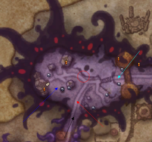 黑色箭头:3级腐化区域荣誉谷入口。青色圆圈:大虫子的具体位置,注意大虫子的击飞技能,还有叠层后导致的昏迷。青色箭头:精英小怪米沙。技能1:冲锋玩家当前方向,并击飞,降低理智并造成中量伤害,注意躲开。技能2:恐惧周围,注意躲开即可。蓝色箭头:精英小怪虫子。技能1:正面喷吐毒液,造成昏迷,注意躲开。技能2:向周围地面喷洒毒液,被击中后会叠毒液层数,注意毒液5层的昏迷。红色箭头:区域最终BOSS雷克萨。技能1:陷阱,随机在地上埋设3枚陷阱,若玩家踩中,会造成昏迷并减少理智,注意别踩!技能2:召唤豪猪:豪猪出来的时候会略微击退玩家,注意别被击退到陷阱上,豪猪会不断的读条减少玩家理智,血量较少,AOE快的可以击杀。但BOSS召唤速度会越来越快。技能3:惊吓,雷克萨召唤出大量幽灵豪猪冲击玩家,注意规避,若被击中会造成大量伤害和理智损失。击杀雷克萨即为净化该区域,若净化该区域,与萨尔的战斗中,萨尔会带着两只豪猪加入战斗。红色圆圈:净化该区域后,可点击此处的风图腾回到力量谷门口。