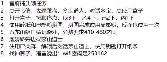 李捕头,然后去蓬莱岛找多宝道人,在包裹里打开盒子,密码是戊3乙4巳2丙1,然后拼图,完了去五龙山找猴子陪它玩游戏分数要在410道480之间,去找茅山道士,然后封印木棺,顺序是第一行第一个,第二行第三行后面四个,第四行第一个,完了之后去找神算子在传音符里说出“WiFi密码是二五三一六二”————结束,回去找李捕头。