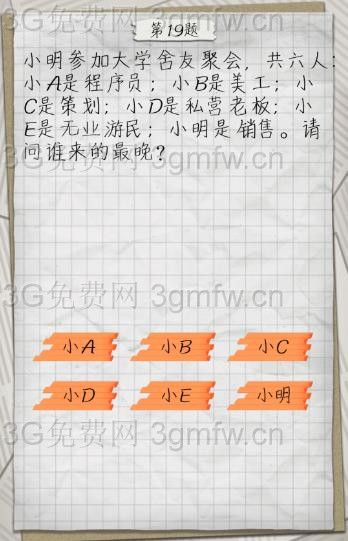小明参加大学舍友聚会,共六人小A时程序员;小B时美工;小C是策划;小D时私营老板;小E时无业游民;小明是销售。请问谁来的最晚是《最囧游戏4》第19关的问题,很多网友不知道怎么过,下面小编给大家带来最囧游戏4第19关攻略答案。