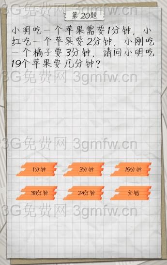 小明吃一个苹果需要1分钟,小红吃一个苹果要2分钟,小刚吃一个橘子要3分钟,请问小明吃19个苹果要几分钟是《最囧游戏4》第20关的问题,很多网友不知道怎么过,下面小编给大家带来最囧游戏4第20关攻略答案。
