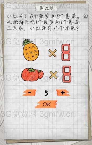 小红还有几个水果是《最囧游戏4》第30关的问题,很多网友不知道怎么过,下面小编给大家带来最囧游戏4第30关攻略答案。 问题:小红还有几个水果? 答案:简单的啦,番茄不是水果是5个。 老友网www.andlaou.com免费为你分享