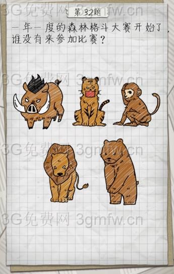 一年一度的森林格斗大赛开始了谁没有来参加比赛是《最囧游戏4》第32关的问题,很多网友不知道怎么过,下面小编给大家带来最囧游戏4第32关攻略答案。
