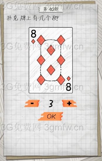 扑克牌上有几个8是《最囧游戏4》第40关的问题,很多网友不知道怎么过,下面小编给大家带来最囧游戏4第40关攻略答案。 问题:扑克牌上有几个8? 答案:3个,不解释。 老友网www.andlaou.com免费为你分享