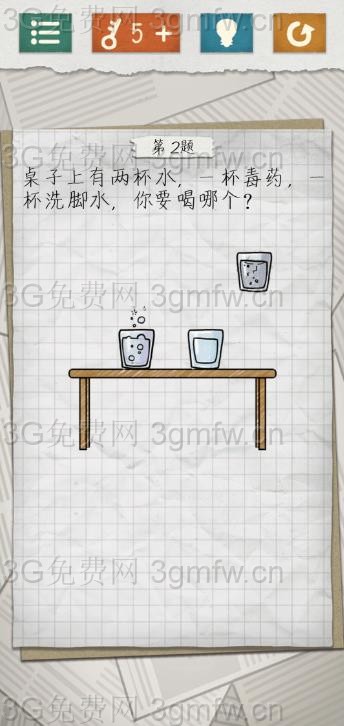 桌子上有两杯水,一杯毒药,一杯洗脚水,你要喝哪个是《最囧游戏4》第2关的问题,很多网友不知道怎么过,下面小编给大家带来最囧游戏4第2关攻略答案。
