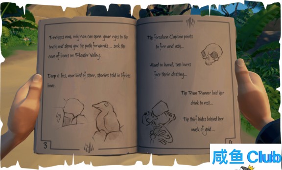 这本高大的故事书是由我们的好朋友咸(Salty)发现的,(Plunder Valley)东侧沉船旁边的骷髅鹦鹉面前。