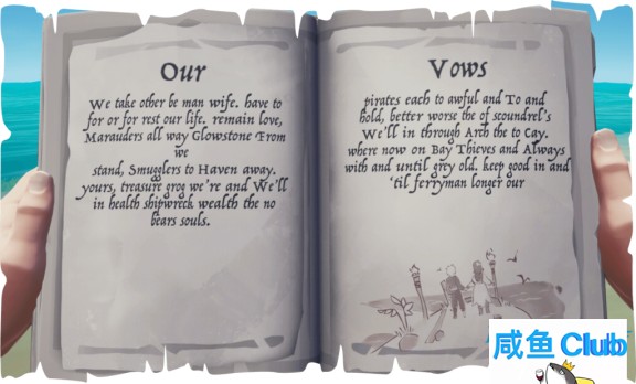 我们的海盗彼此欺负。无论好坏,拥有和持有。对于我们的无赖生活。我们将一直保持着爱情,穿过掠夺者拱门一直到发光石礁。从我们现在所站在的地方,到走私者湾,再到盗贼的天堂。永远都是你的,带着财宝和熟料,直到我们变老了。我们将在沉船和财富中保持健康,直到渡轮客不再担负我们的灵魂。
