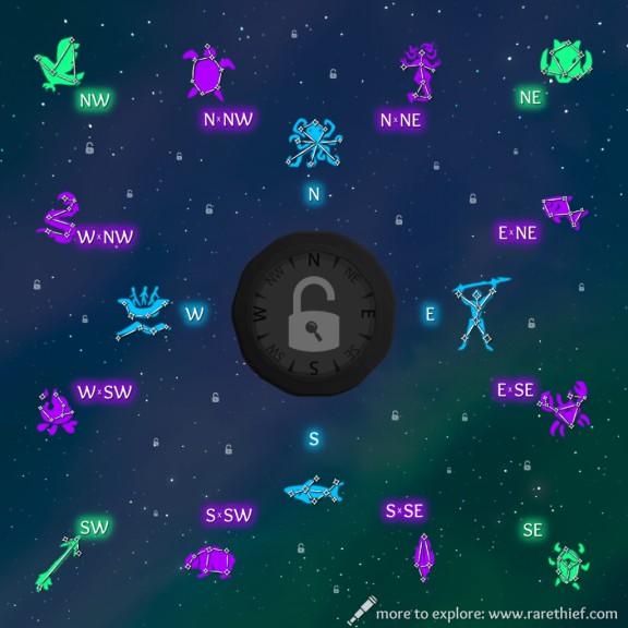 例如,如果故事要求您前往箭号,您将从当前位置前往西南。为了帮助您的旅途,我们制作了一个信息图,描绘了每个星座对应的指南针方向。
