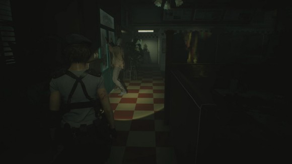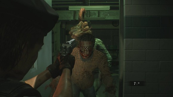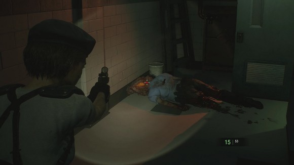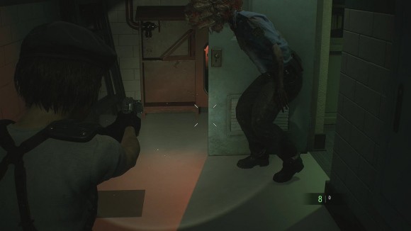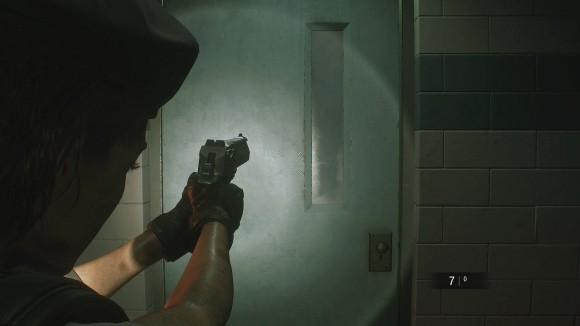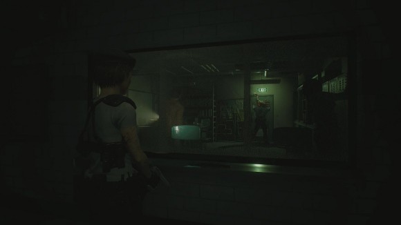 接下来就是前期的难点之一,从玻璃看到控制室放散弹枪的地方有3只丧尸,其中一个拍门的是大触