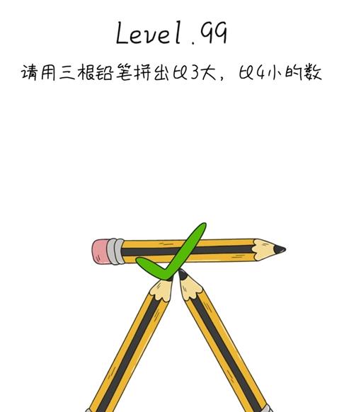 请用三根铅笔拼出比3大比4小的数是抖音《脑洞无限开》第99关的问题,很多玩家还不知道怎么过答案是什么,为了让大家快速通关,小编带来了抖音脑洞无限开第99关攻略。