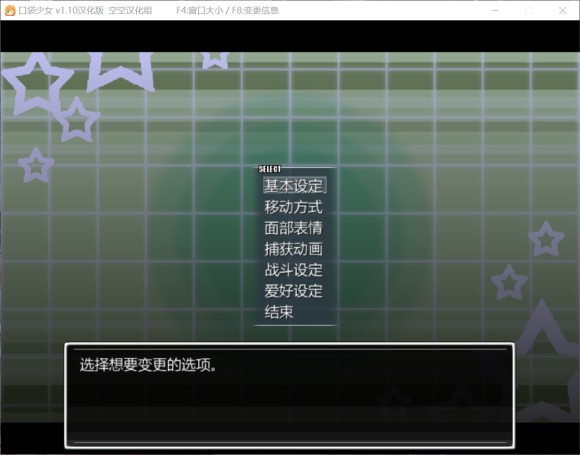 然后是一些设定,移动方式选步行(这里选的是按住shift的移动方式,选步行默认就是奔跑),不然太慢。面部表情,捕捉动画(捕捉带h画面)随意。战斗方式,轮换或淘汰,轮换是每打死一个敌人可以选是否换宠,淘汰是只有阵亡后才能换宠,轮换太慢(而且大部分时候都不需要换宠),推荐淘汰。爱好是否回收持有物,就是放回电脑后是否回收少女身上的装备,推荐回收。这些随时可以在菜单里改
