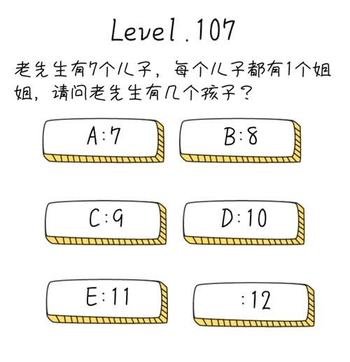 老先生有7个儿子每个从子都有1个姐姐请问老先生有几个孩子是抖音《脑洞无限开》第107关的问题,很多玩家还不知道怎么过答案是什么,为了让大家快速通关,小编带来了抖音脑洞无限开第107关攻略。
