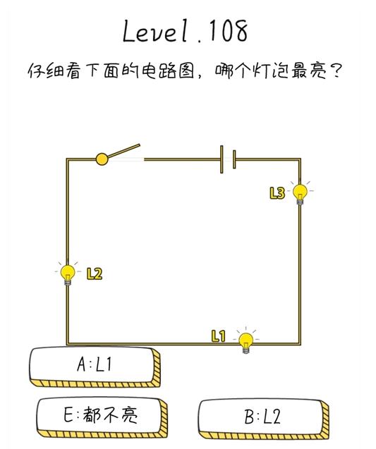 仔细看下面的电路图哪个灯泡最亮是抖音《脑洞无限开》第108关的问题,很多玩家还不知道怎么过答案是什么,为了让大家快速通关,小编带来了抖音脑洞无限开第108关攻略。
