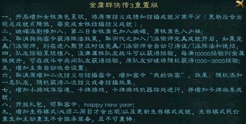 而重制版的华山之巅巨难,因为与原版相比,东方不败那一回合不再是东方不败一人,而是东方不败和南海神尼,天山童姥以及李秋水等四个强有力的角色联手。之后一回合加上了金三四佬(就是游戏开头对话的那四人张三丰黄裳独孤求败达摩),如果你和你的队友属性不是那么过硬的话,就算你能挺得过东方不败那一关,这四个人能把你们打到绝望(这四个人要比最后的醋仙牛逼太多,高血高防高敏,人家血本来就厚,而且拆招还高你属性不够的话根本打不动,而且有时候能连打三个以上的闪避简直让人绝望,这一回合才是最难过的。而且重制版入武当没办法刷无限内血)。最后的醋仙,属性不硬的话,磕着药可以打过,而且醋仙没有内力(不知道是不是bug)。但是让人崩溃的是,醋仙有几率回满血!你可以感受到左打一个闪避右嗑一瓶药,好不容易醋仙的血已经见底,你以为胜利在望的时候,人家忽的满血复活这样的绝望吗?一周目已经很难打了,但是跟二周目比起来,简直是热身运动!