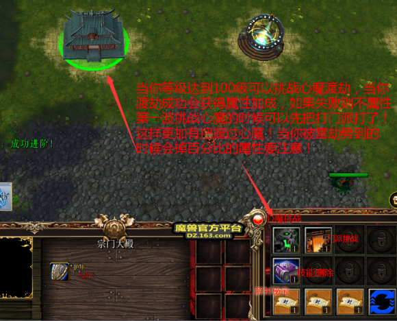 当你到100级时就可以开始挑战心魔渡劫了点击宗门大镇那个屋子就可以开启挑战心魔了,让你的属性更上一成楼,修炼等级最高等级为渡劫期!