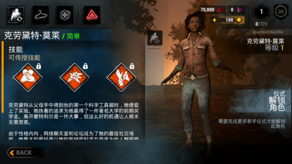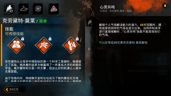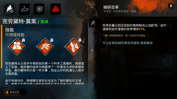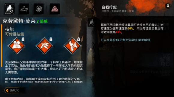 1. 克劳黛特·莫莱(俗称黑妹)完成新手任务即可获得的角色,拥有自我治愈和寻找并帮助其他受伤求生者的能力,便于求生者养成帮助其他求生者,一起逃离出口获得游戏胜利的习惯。而且她的三个传承技能都十分出色,大多数角色都能用得上,是非常好用且前期必要练习的角色,另外提一点小玩法:由于游戏整体偏暗且黑妹角色较黑,必要时可以使用下蹲变蘑菇大法欺骗一些眼拙的屠夫(请不要过度尝试来挑战屠夫的视力下限)