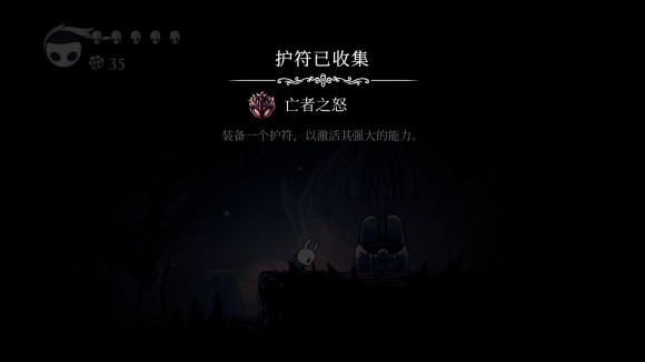 打开宝箱,获得我们的第一个护符,亡者之怒(俗称红泪,在生命值只有1的时候你的攻击增加50%向上取整,比如我们现在是5,装备后一滴血的时候,就是8),注意护符只有在坐椅子的时候才能装备,现在打开背包无法装备