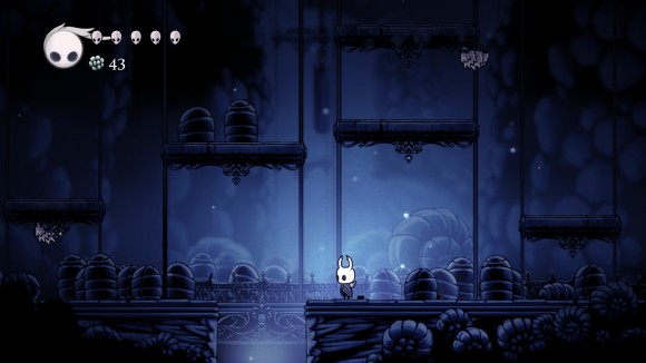 来到这里,我们跳起来是可以看到有一个面具碎片的(每收集4个面具碎片,你的血量上限就会+1),大家可以看到图片里右上有一条小道我们可以往上,从那里上去绕一拳就能拿到这个面具碎片,但是现在你会发现你跳不上去,当然现在我们也是有办法拿的,这就需要skip了,不过面对一周目的新人,我们就不搞这些花里胡哨的以后再来拿也没问题,如果想现在得到的话就留言一下,我会告诉你需要什么样的skip