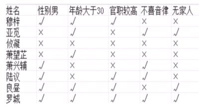 整理上述线索,可以知道,此人品阶较高、大于三十岁,男性,不喜音律,没有亲人。 (其中有一处为两人需沟通的人物,萧望芷,在皇帝的剧本中,萧望芷是男性,不知是否有家人,而在明宸的剧本中,确切提出了,萧望芷为萧兴辅的姐姐,女性,有家人。)