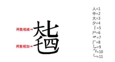 根据所得推测仅有一个偏旁和一个数字的音,当“厂”出现时,数字为四,当“勺”出现时,数字为五,当“夕”出现时,数字为二,可推知,当只有一个偏旁和一个数字时,偏旁为数字乘2。