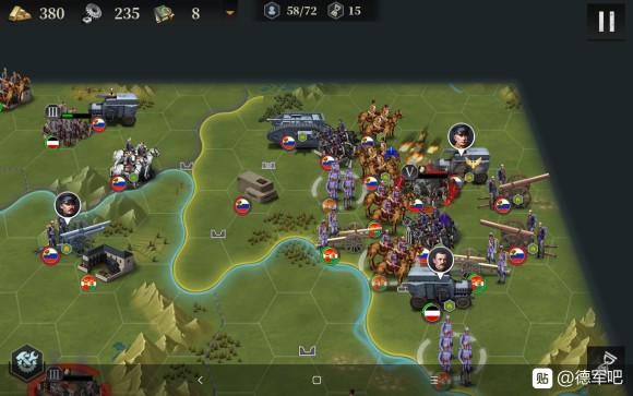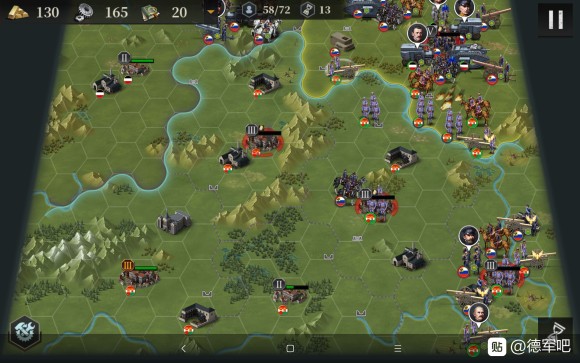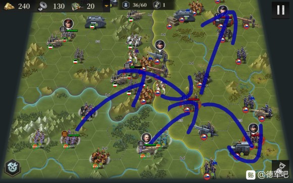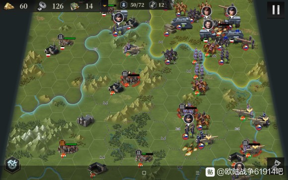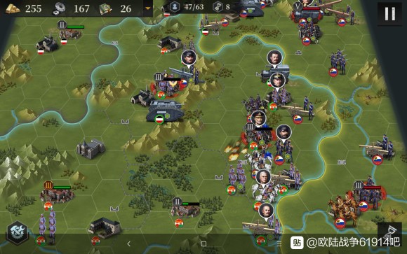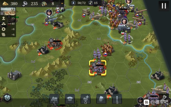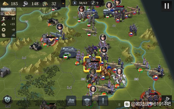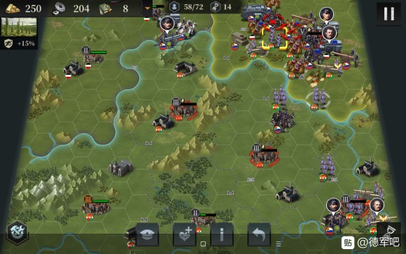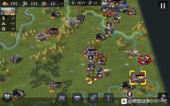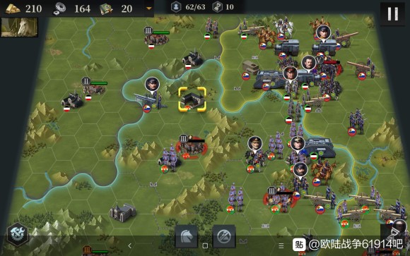 接下来我们开始造飞机轰炸,同时俄国炮兵去北边,为了防止他去搞事情,我们让出城市给他炮击。南部的炮兵群推掉了南边3级城市,我们也造了5个轰炸,并且把步兵移过去,准备偷城