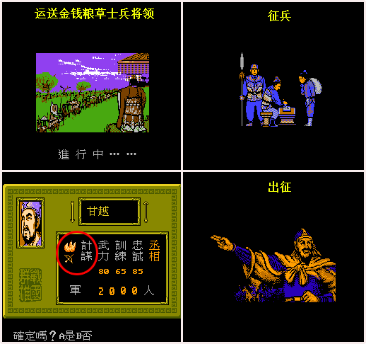 只能攻打邻近的对手城池,战斗前须选择金钱数、粮食数、武将。