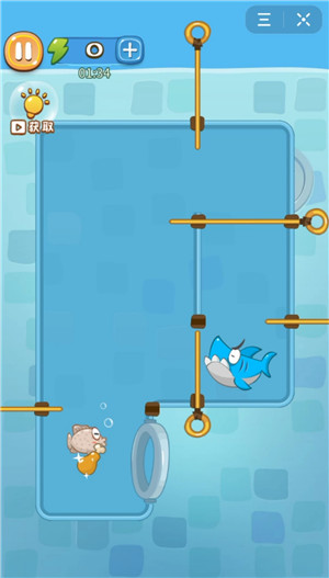 1、打开蓝色鲨鱼与红色鲨鱼中间的拉针,两鱼相争,只剩一条。