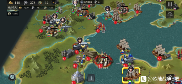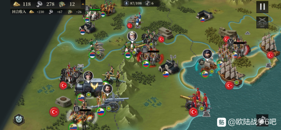 总体思路就是磨阿布杜尔克里姆的血量,重点是要在阿布杜尔克里姆死的那一回合完成对君堡的夹击,这就需要克里米亚下来的残血民兵完成,所以这个残血民兵不要提前到君堡旁边,避免被大要塞溅射。二级城必要时可以放弃交给塞尔维亚,保护好尼跑跑装甲车血量。