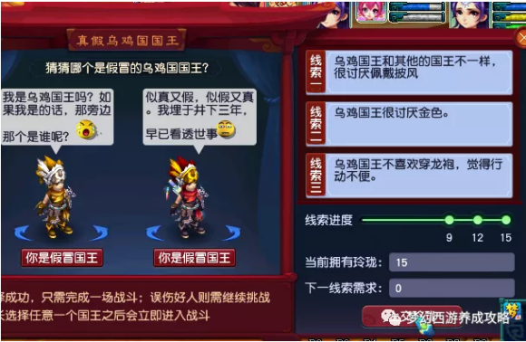 两个国王,选一个进入战斗,对国王用照妖镜,战斗中用道具选,真国王无效果,会逃跑,打败后还需与假国王战斗,用照妖镜秒杀假国王,清楚小怪后完成副本,图中左边是假国王打完直接结束,想打两场就要先选真国王。