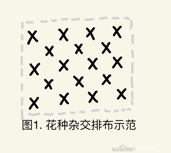 重复说明,浇水的动作在动森中一个是可以让花株繁殖,也就是同色复制(除去铃兰和金玫瑰),那么另一个则是让不同色花株相互杂交。花株复制的动作可以从1朵花开始产生,但几率也是很低的,这个是可以理解的。而杂交则至少至少需要两朵花。而假设是以一定数量的花株进行杂交,那么仍旧以刚才的杂交X网格图为例,可以是一列A色X花 一列 B色 X花以此类推,(或行或列或斜列)。而理论上来说只要需要杂交的至少两颗花株不要相隔超过一格,都是可以产生新的花株的,图2是一个简单的例子,当然这个可以自有安排。
