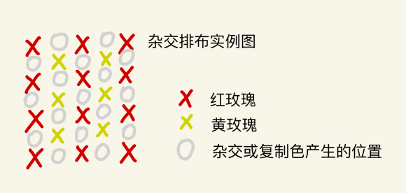 而现在普遍采用的种植排布方式为X型网格种植,也就是如下图1所示这样,这样花色产生的几率也是相对比较高的