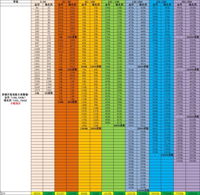 由于金币数量从46级开始、强化药从54级只显示到千位,所以总数统计会略有一些微小误差(无法测出到具体个位数)。从1级升到300级大致需要金币168.6m、强化药351.8m,在100级之后进阶消耗英雄材料卡时,会获得一部分强化药(具体依据材料卡的等级获取)。