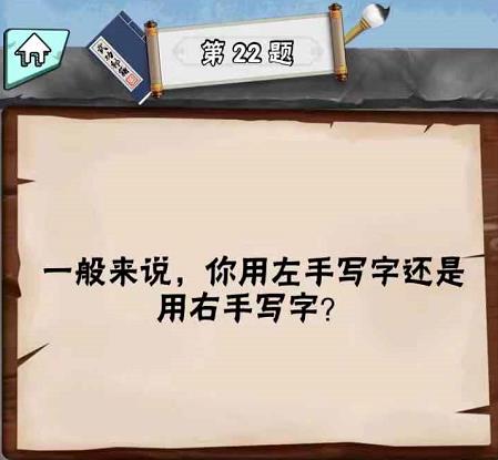 “一般来说你用左手写字还是用右手写字?”是脑筋急转弯达人LV1第22关问题,很多玩家还不知道答案是什么,接下来小编为你带来脑筋急转弯达人LV1第22关答案。