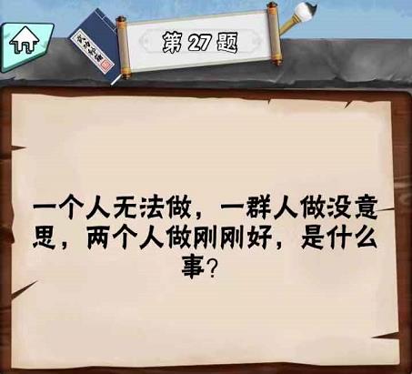 “一个人无法做一群人做没意思两个人做刚刚好是什么事?”是脑筋急转弯达人LV1第27关问题,很多玩家还不知道答案是什么,接下来小编为你带来脑筋急转弯达人LV1第27关答案。