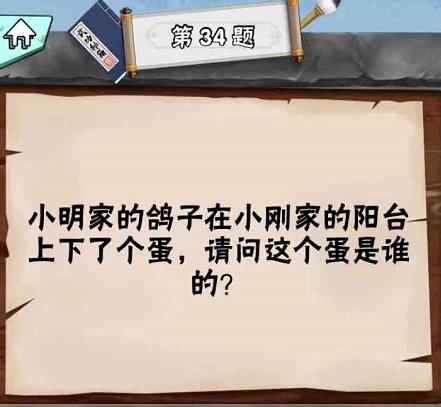 “小明家的鸽子在小刚家的阳台上下了个蛋请问这个蛋是谁的?”是脑筋急转弯达人LV1第34关问题,很多玩家还不知道答案是什么,接下来小编为你带来脑筋急转弯达人LV1第34关答案。